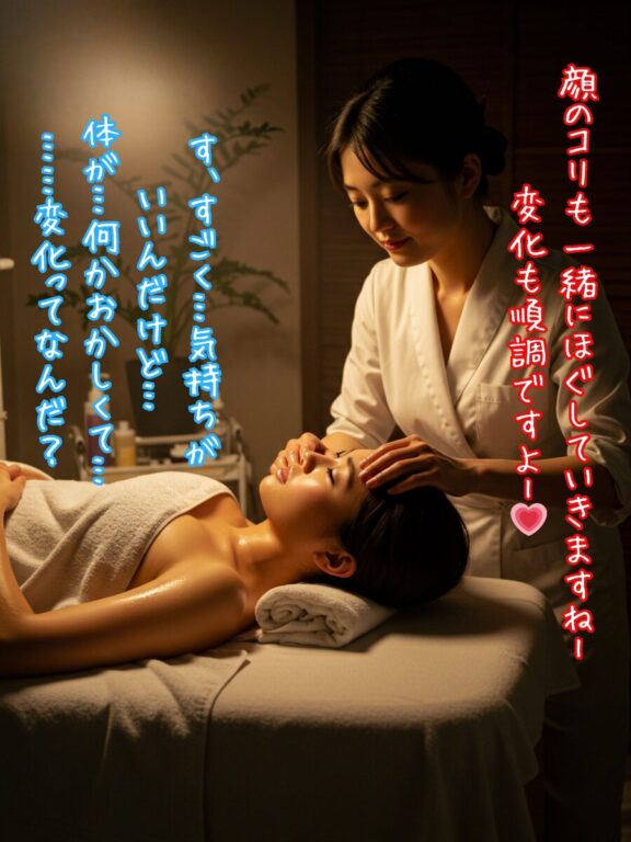 とろり、と温かいオイルが首筋に垂れた。ぬちゅっ、ぬるん──その指先が肩から背中、そして腰へとなめらかに流れていくたび、皮膚の感度が異常に研ぎ澄まされていく。
