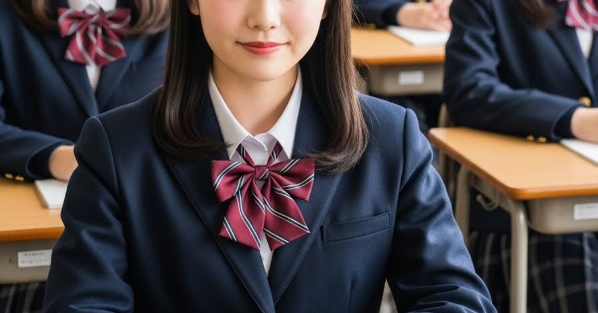 翌朝、ブレザーの胸元に赤いリボンをきゅっと結ぶ。